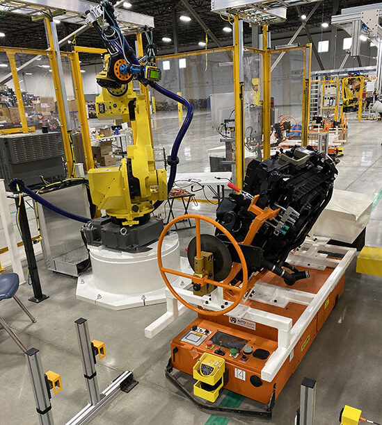 - Flexible Conveyance Systems – Automation technologies that can be flexibly redeployed once installed, such as Automated Guided Vehicles and Autonomous Mobile Robotics (see below), have found wide use in applications like delivering kitted materials to point-of-use on an assembly line, as well as transporting product like cars, trucks, and tractors through their assembly processes. Autonomous mobile robots are commonly used as an alternative to fork trucks and are typically tasked with transporting components as part of lineside replenishment operations for electric vehicles, agricultural equipment, and medical device manufacturers. Automated guided vehicles have seen wide adoption among manufacturers of heavyweight products because of the safety advantages that come with automation technologies over manual options.